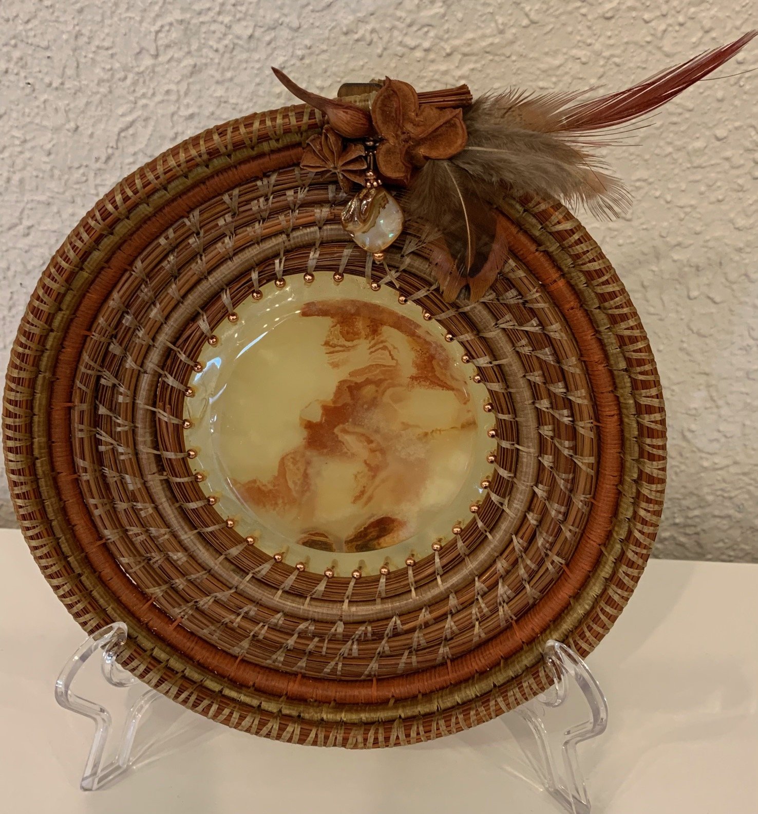 Lisa wanted to start incorporating pine needles in her gourd work. This was a little more complicated than she initially anticipated, so she enrolled in multiple classes at the local junior college. The outcome of marrying the two genres was lovely, but she then became “hooked” on weaving pine needle baskets alone. Lisa has been challenging herself this winter to push her boundaries by assuring that she includes a new set of skills with each new basket she makes. “This has been a most satisfying endeavor this winter” she states.” I still love making framed wall pieces and the cards, but for now my time and energies have gone toward gourd & basket work.”